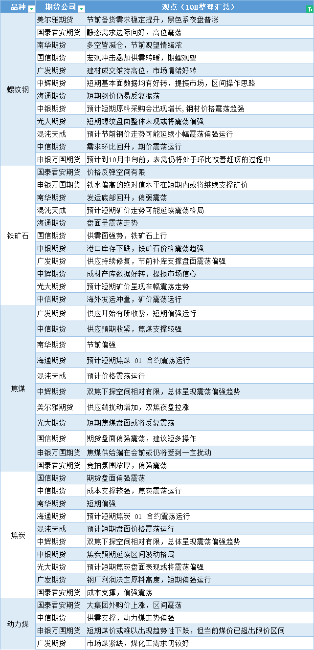 期货公司观点汇总一张图:9月27日黑色系(螺纹钢、焦煤、焦炭、铁矿石、动力煤等)